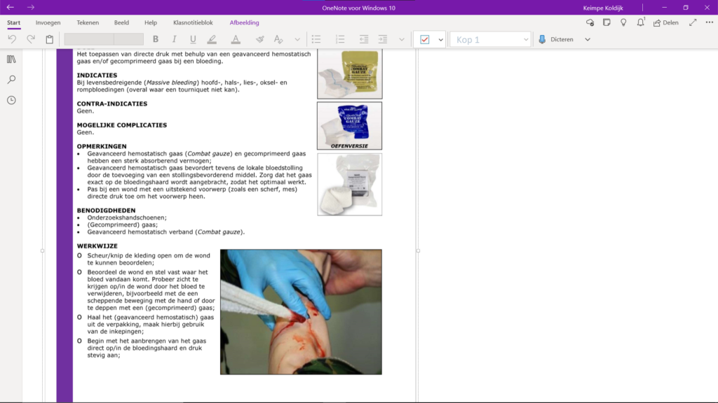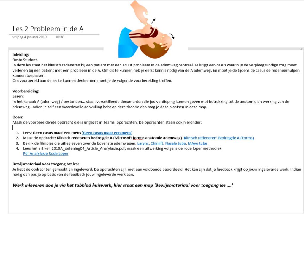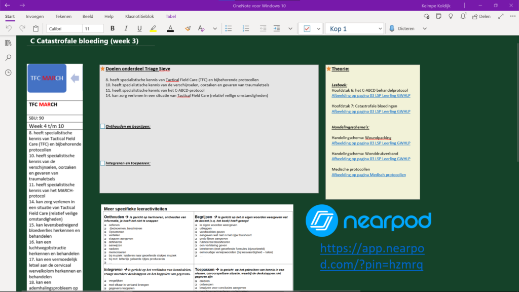 Bovenstaande indicatoren wil ik aantonen door middel van voorbeelden uit de lessenreeks ‘Medisch Handelen Tijdens Crisissituaties. Tijdens deze lessen is het werken vanuit een OneNote omgeving de basis. De student begint op de ‘landingspagina’ van de les. Elke les wordt ondersteund door middel van een student paced Nearpod sessie. Gezamenlijk verkennen we de bijbehorende theorie en belangrijke begrippen, in het voorbeeld hieronder weergegeven in het gele blok. De informatie die hier staat is voorzien van een hyperlink naar de betreffende alinea in de begeleidende reader met handelingsschema’s en achtergrondgrond informatie.