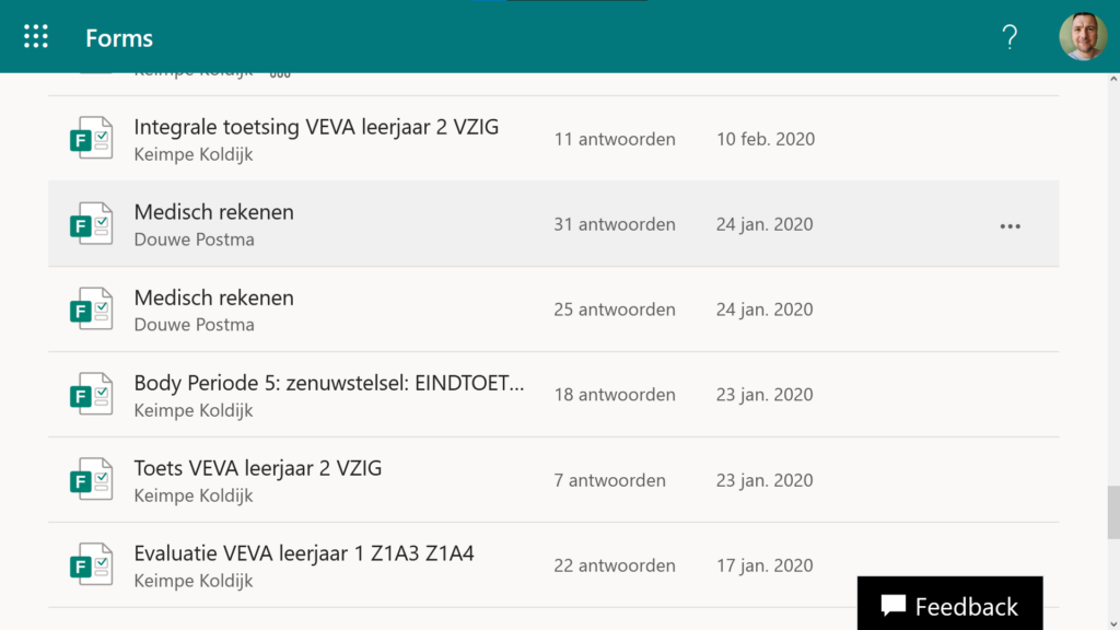 Hier links een schermafbeelding van mijn Microsoft Forms omgeving. Deze applicatie is makkelijk in gebruik en voorziet op verschillende manieren van data die kunnen helpen bij de analyse van bijvoorbeeld de toetsen.