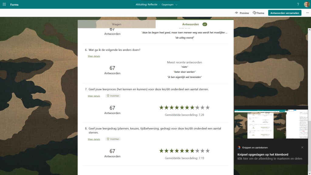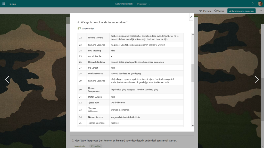 Naast het formatief toetsen van declaratieve kennis gebruik ik Microsoft Forms ook ter afronding van een les gebaseerd op zelfregulerend leren (hierboven beschreven bij 4.1.3. Dit is een vorm van formatief evalueren, deze vorm van evalueren dient ertoe om inzicht te krijgen in het leerproces van de student en kan de basis zijn voor een gerichte instructie, feedback of het verder op weg helpen van de student (SLO, 2021).