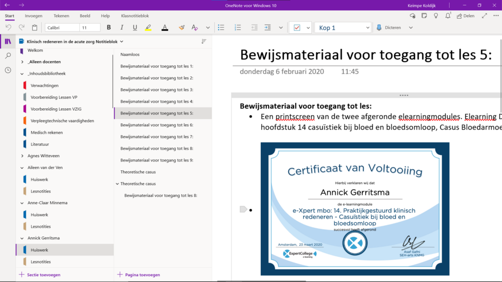 Een onderdeel van de voorbereiding op het praktijkgedeelte van de les vindt plaats in de online leeromgeving van het boek ‘Praktijkgestuurd Klinisch redeneren’ van Pearson. Na het behalen van een online module ontvangt de student een certificaat, dit certificaat wordt door de student geplaatst in het online portfolio in OneNote. Bijgaand links een voorbeeld van hoe dit er uit ziet.