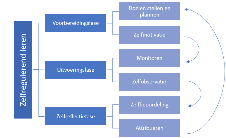 Zelfregulering betekent dat de student op basis van eerdere ervaringen een leerproces uitzet. Dit gebeurt veelal in drie stappen, namelijk vooraf (oriëntatie), tijdens (controle) en na (beoordeling) (Onstenk, 2018). Zimmerman (2000) heeft dit in een model gegoten (hier links) waarin hij spreekt van de forethought phase (voorbereidingsfase), performance phase (uitvoeringsfase) en self-reflection phase (zelfreflectiefase).