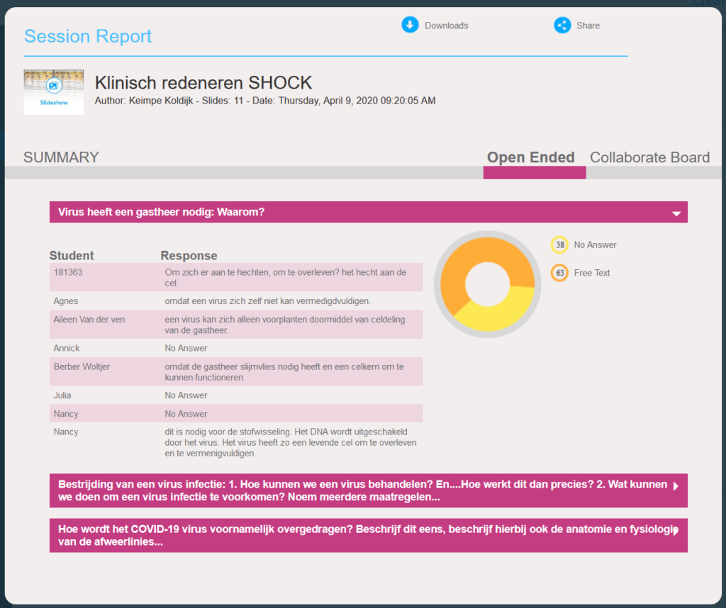 In onderdeel 4.1.3. heb ik reeds beschreven dat ik Nearpod functionaliteit gebruik voor het vaststellen van persoonlijke leerdoelen en voor het bepalen van de belangrijkste begrippen van de les. Deze onderdelen vinden klassikaal plaats. Elke sessie wordt door Nearpod automatisch opgeslagen, tijden en na de sessie kan ik een rapport inkijken. Het rapport geeft mij informatie over welke antwoorden er zijn gegeven. Op deze manier kan ik het leren en het denken van de studenten inzichtelijk. De antwoorden kunnen ook de basis zijn voor een onderwijsleergesprek.